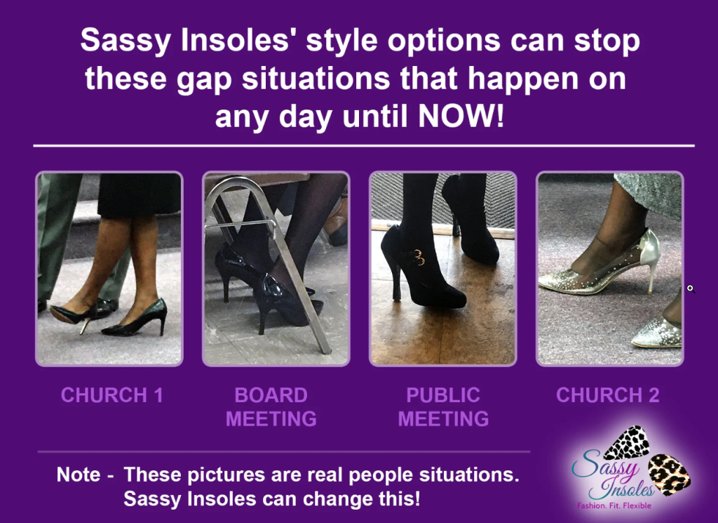 This picture shows the real situations that we’ve seen in different settings – meetings, church, school board meetings, airports. It could also happen or has happened to you (or maybe your friend?) where the gap was there, and you thought – wow. Sassy Insoles is a NOW and IN THE MOMENT SOLUTION – NO MORE GAPS!